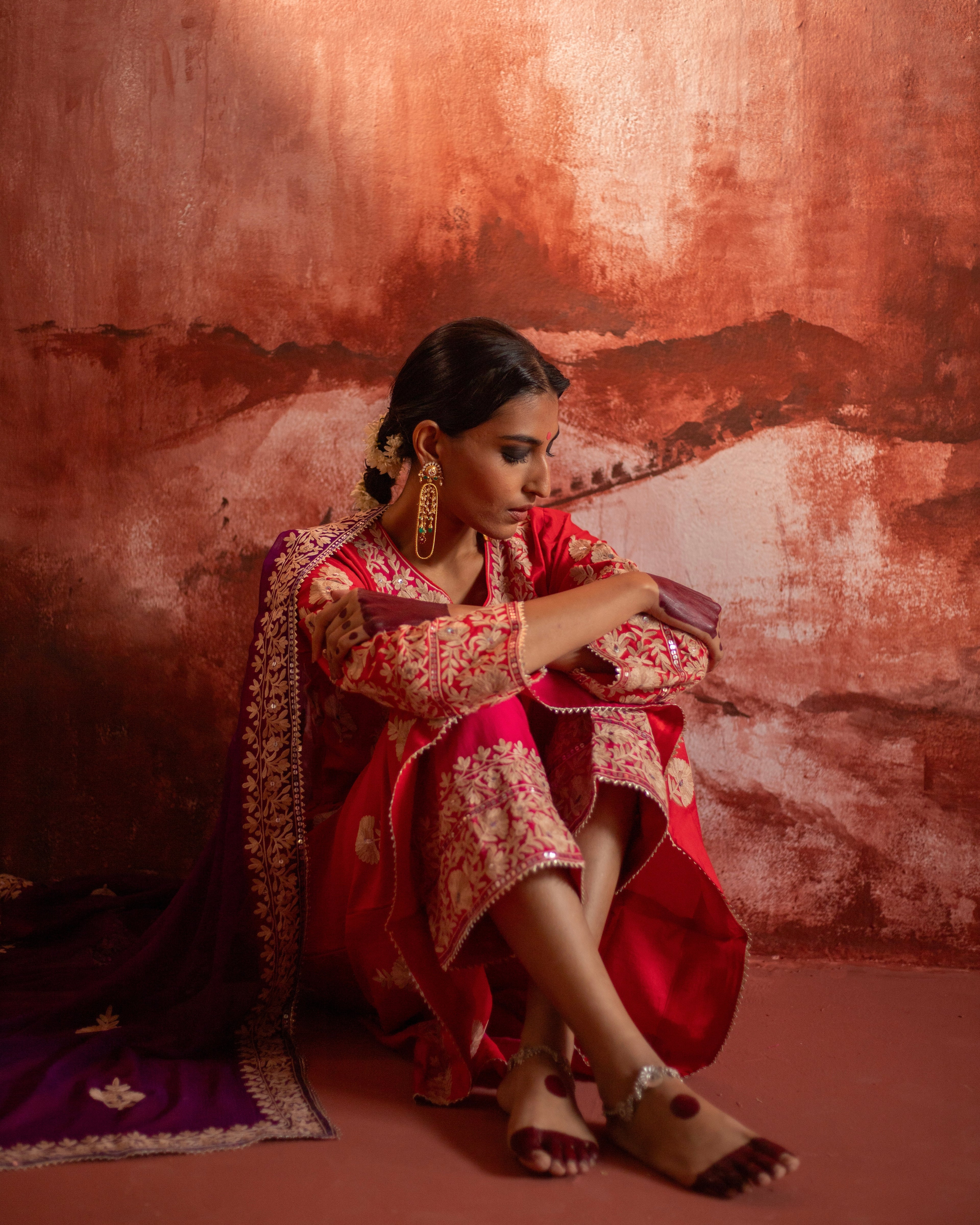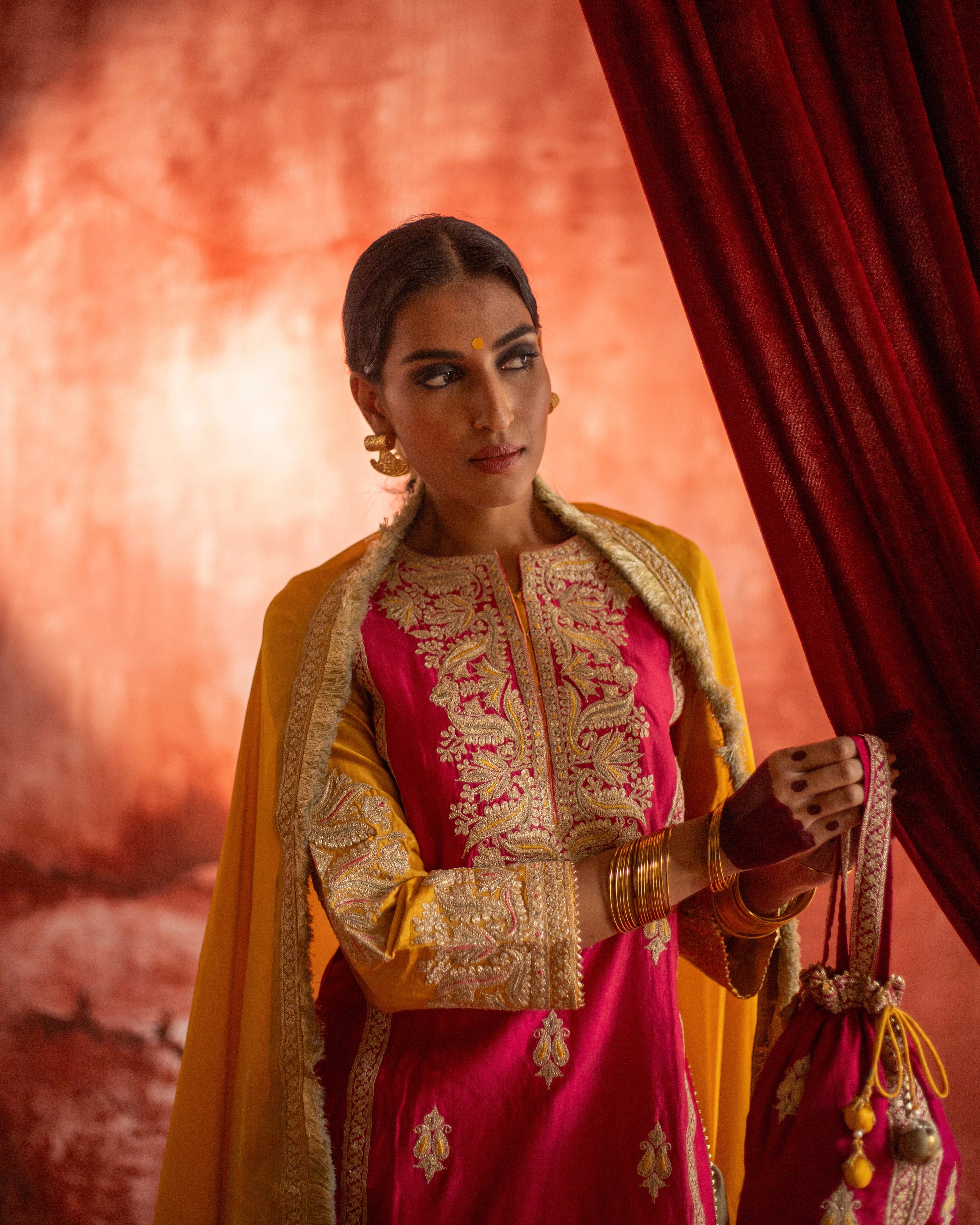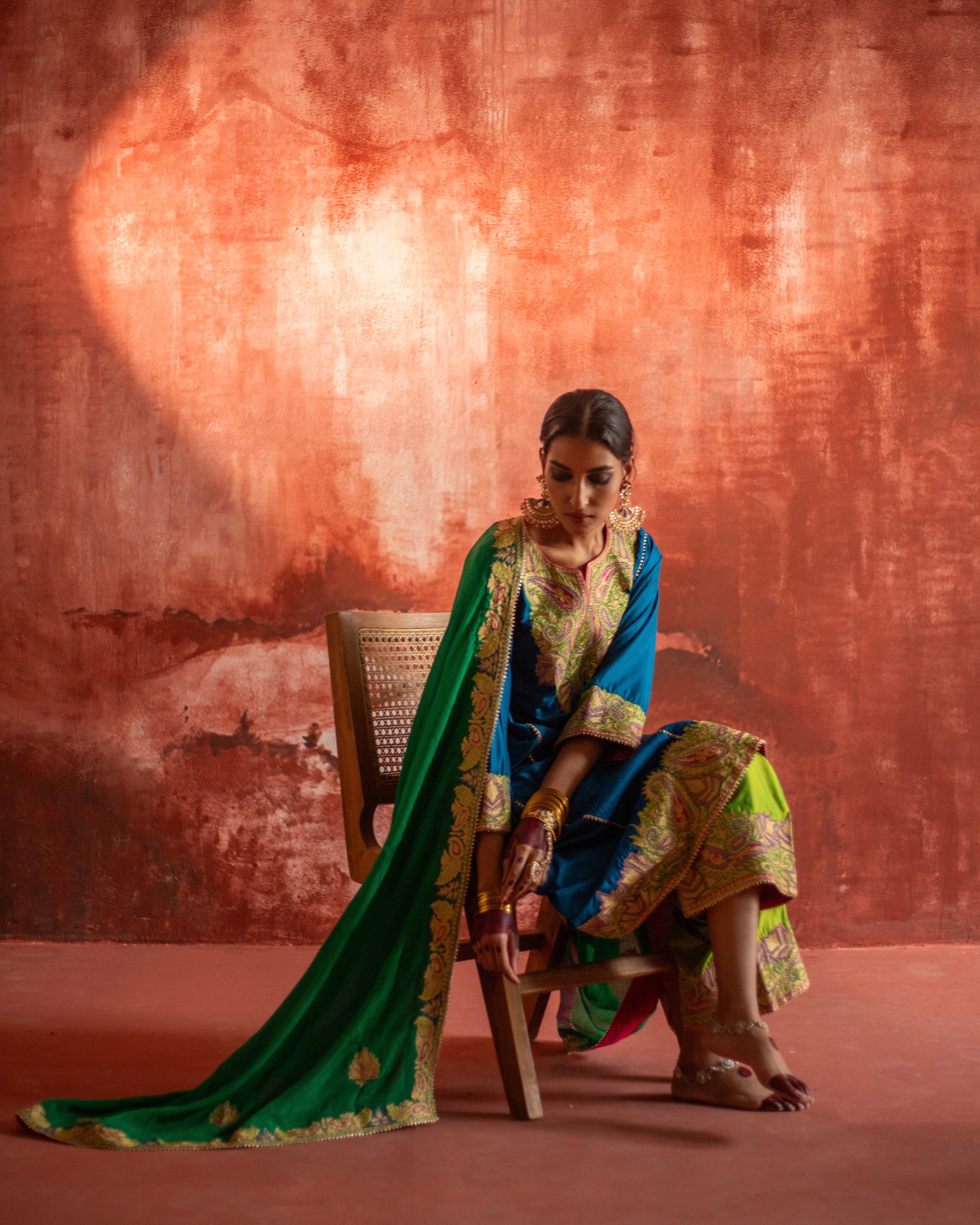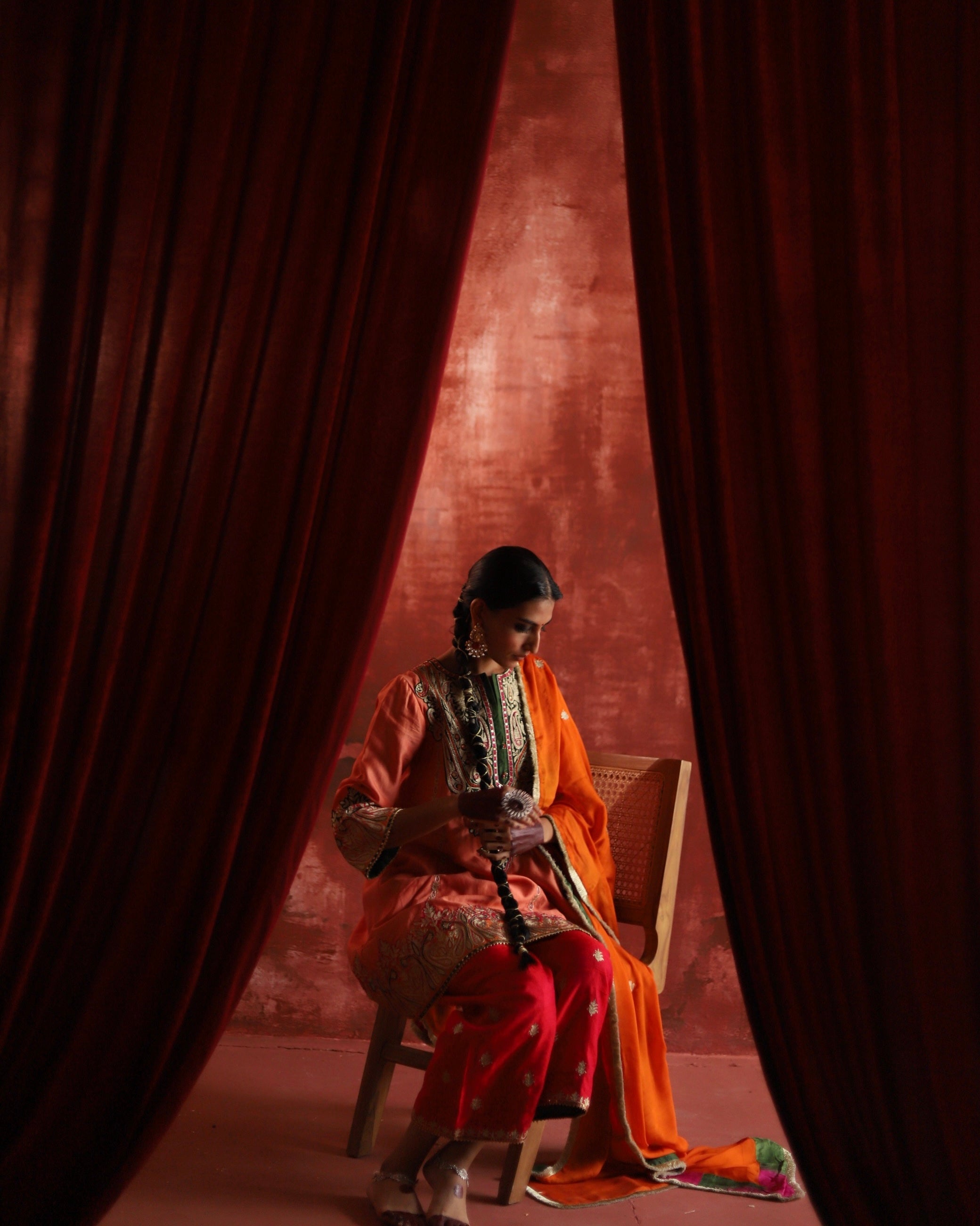 The tender morning light gently spilling through the open windows. The mingling aromas of mithai, haldi, chandan, fresh flowers along with the echoes of bhajan & sangeet. The lively chatter and preparations and as the curtain lifts Din Shagna Da reveals a collection showcasing timeless beauty, age old embroideries and heart of the bride's journey. The shaddi ka joda, a symbol of love and tradition, the sweet anticipation of a new beginning.