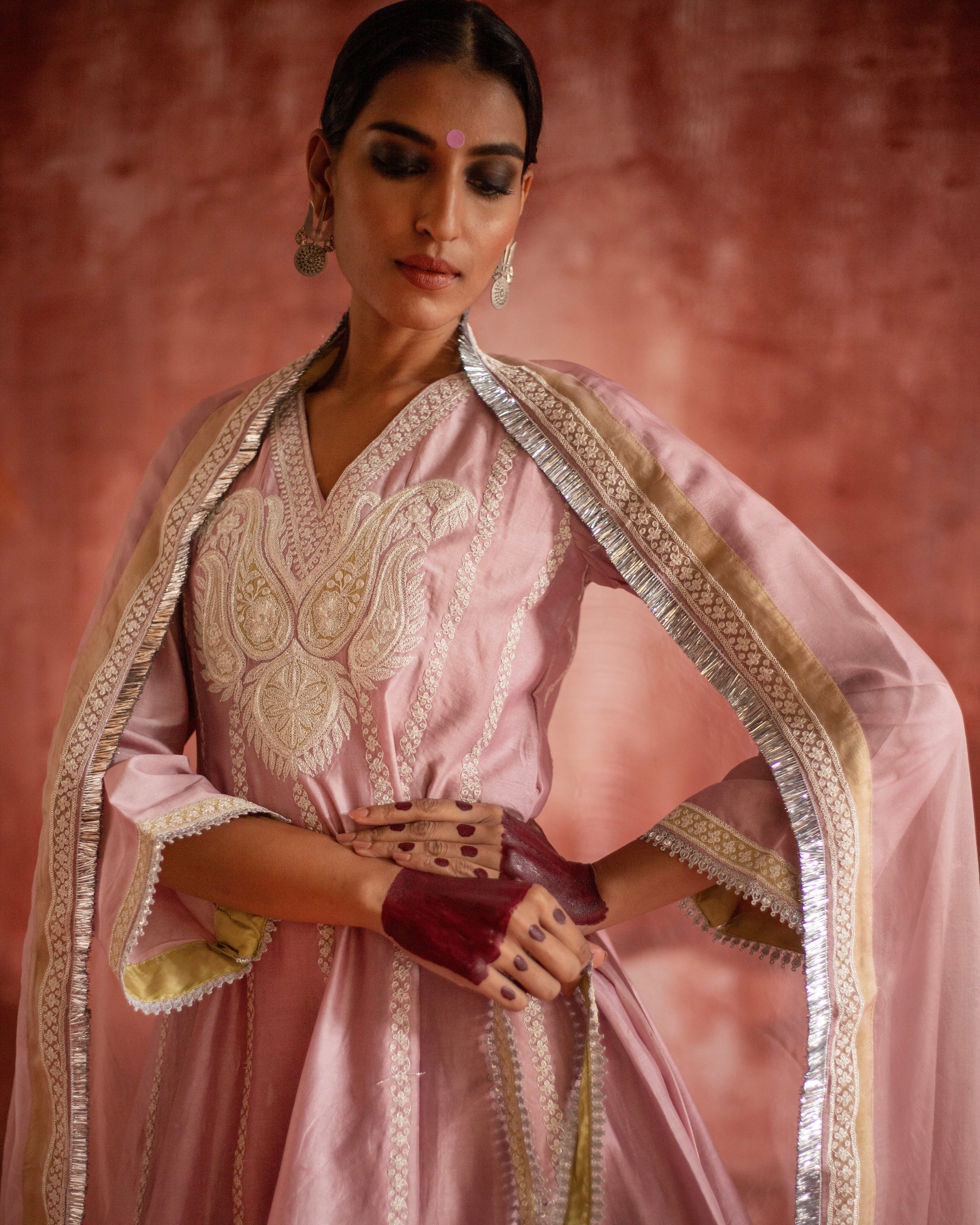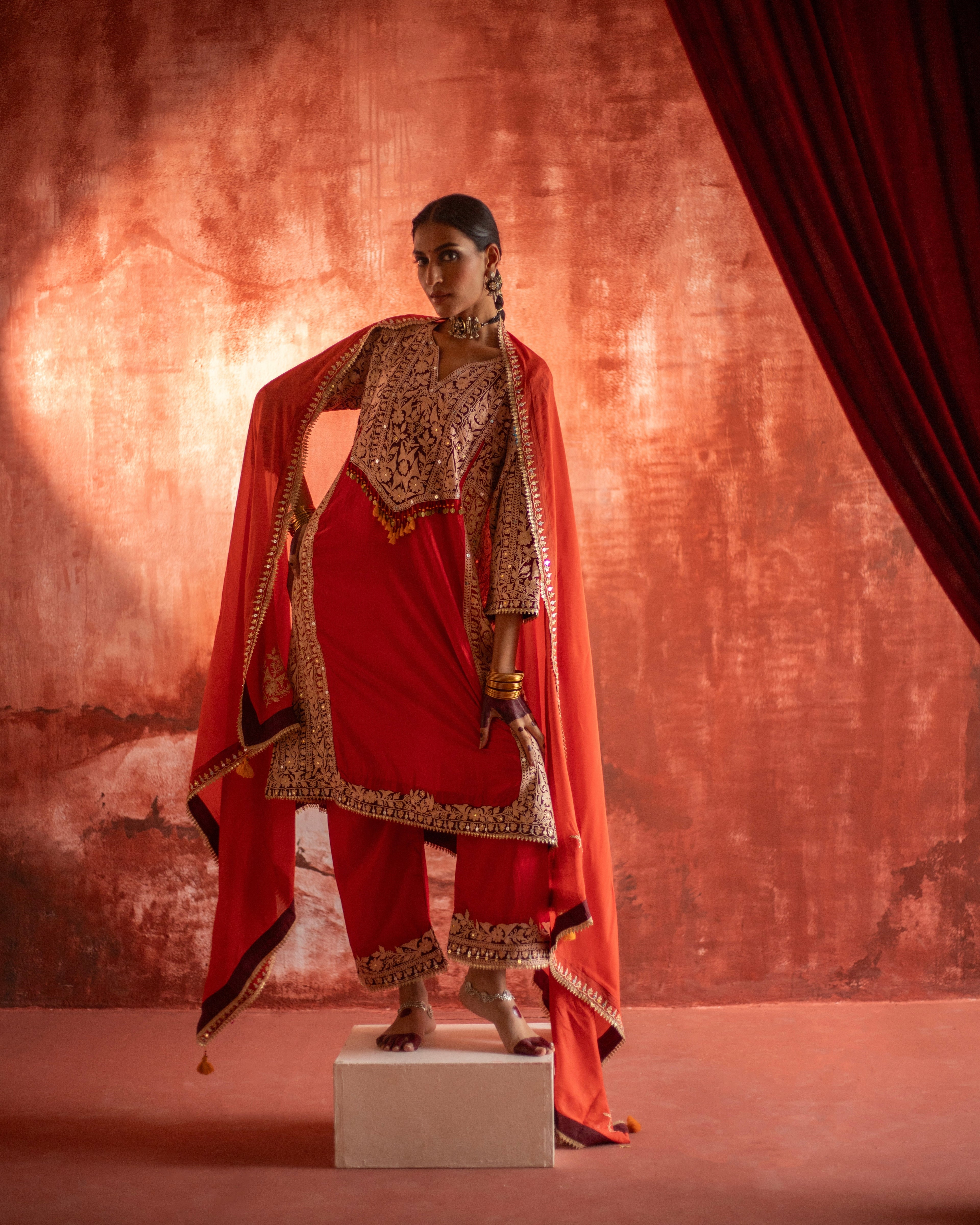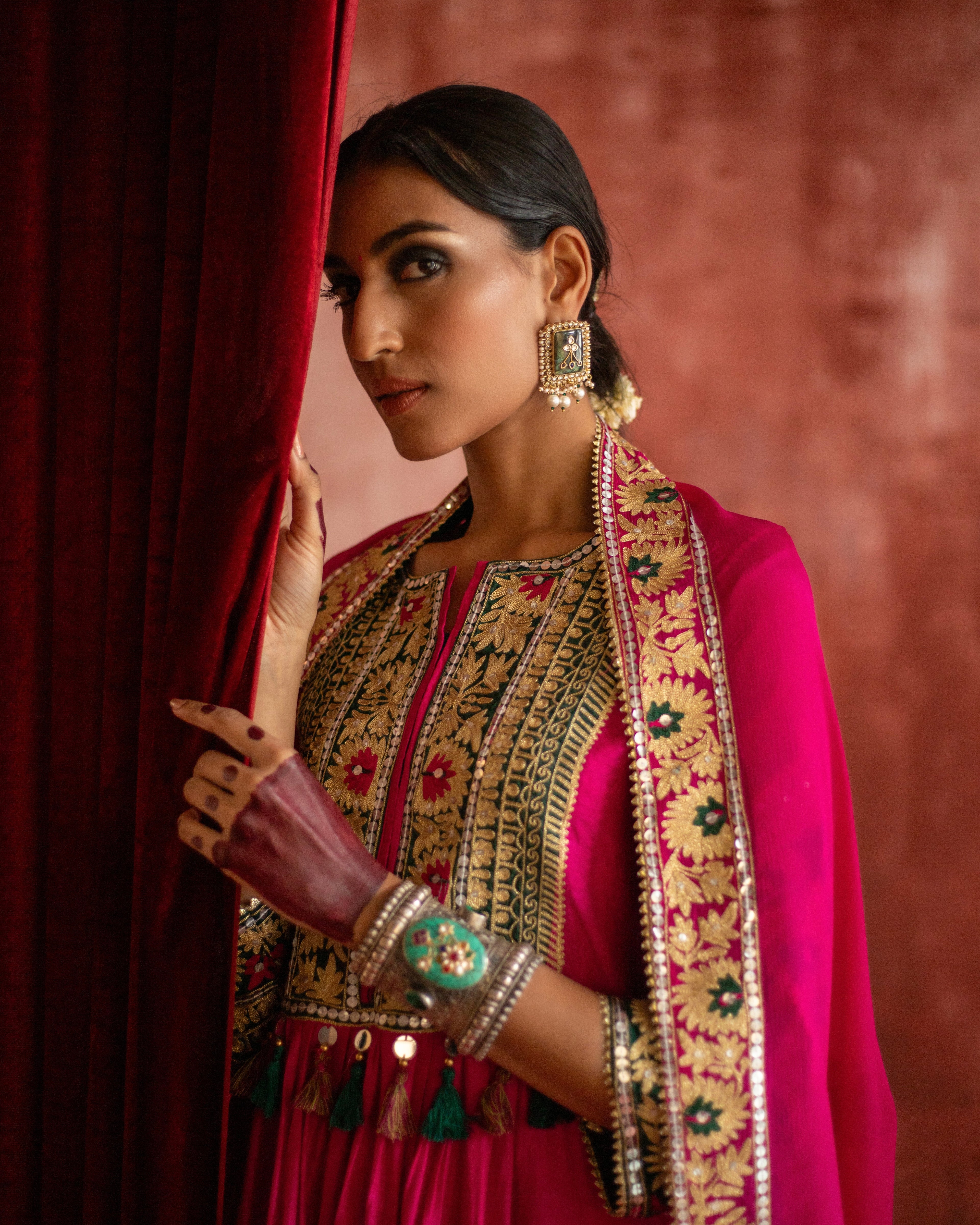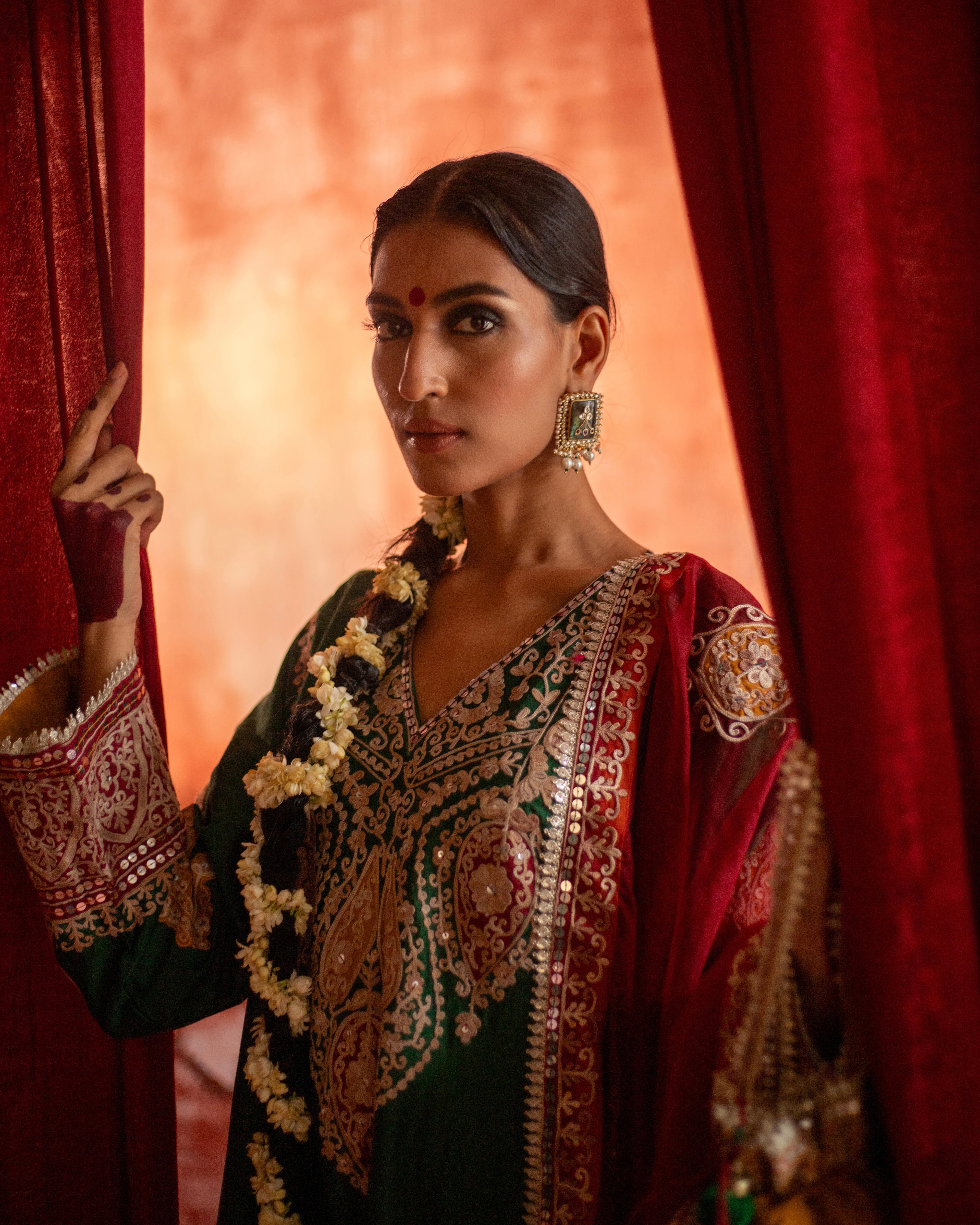 The tender morning light gently spilling through the open windows. The mingling aromas of mithai, haldi, chandan, fresh flowers along with the echoes of bhajan & sangeet. The lively chatter and preparations and as the curtain lifts Din Shagna Da reveals a collection showcasing timeless beauty, age old embroideries and heart of the bride's journey. The shaddi ka joda, a symbol of love and tradition, the sweet anticipation of a new beginning.