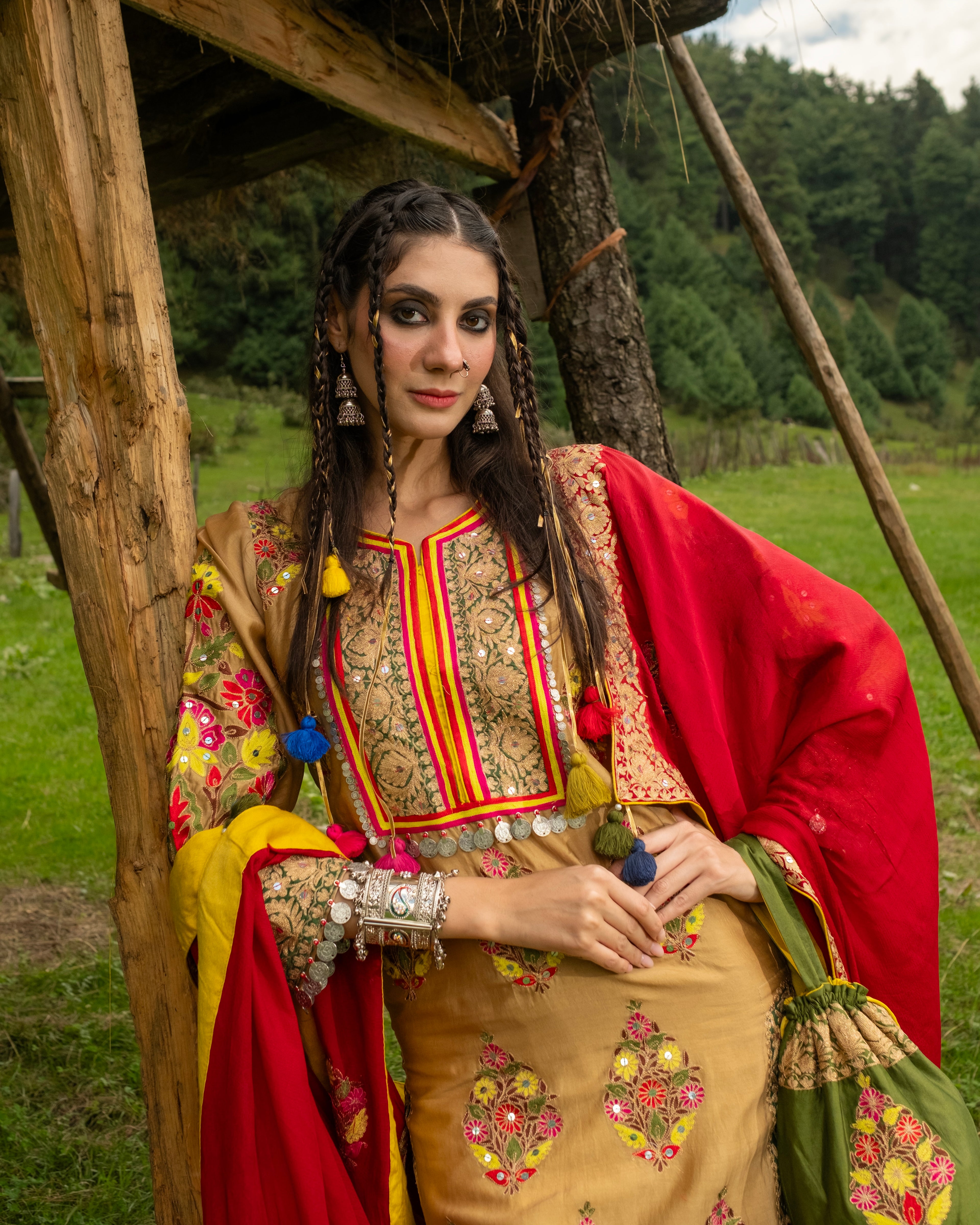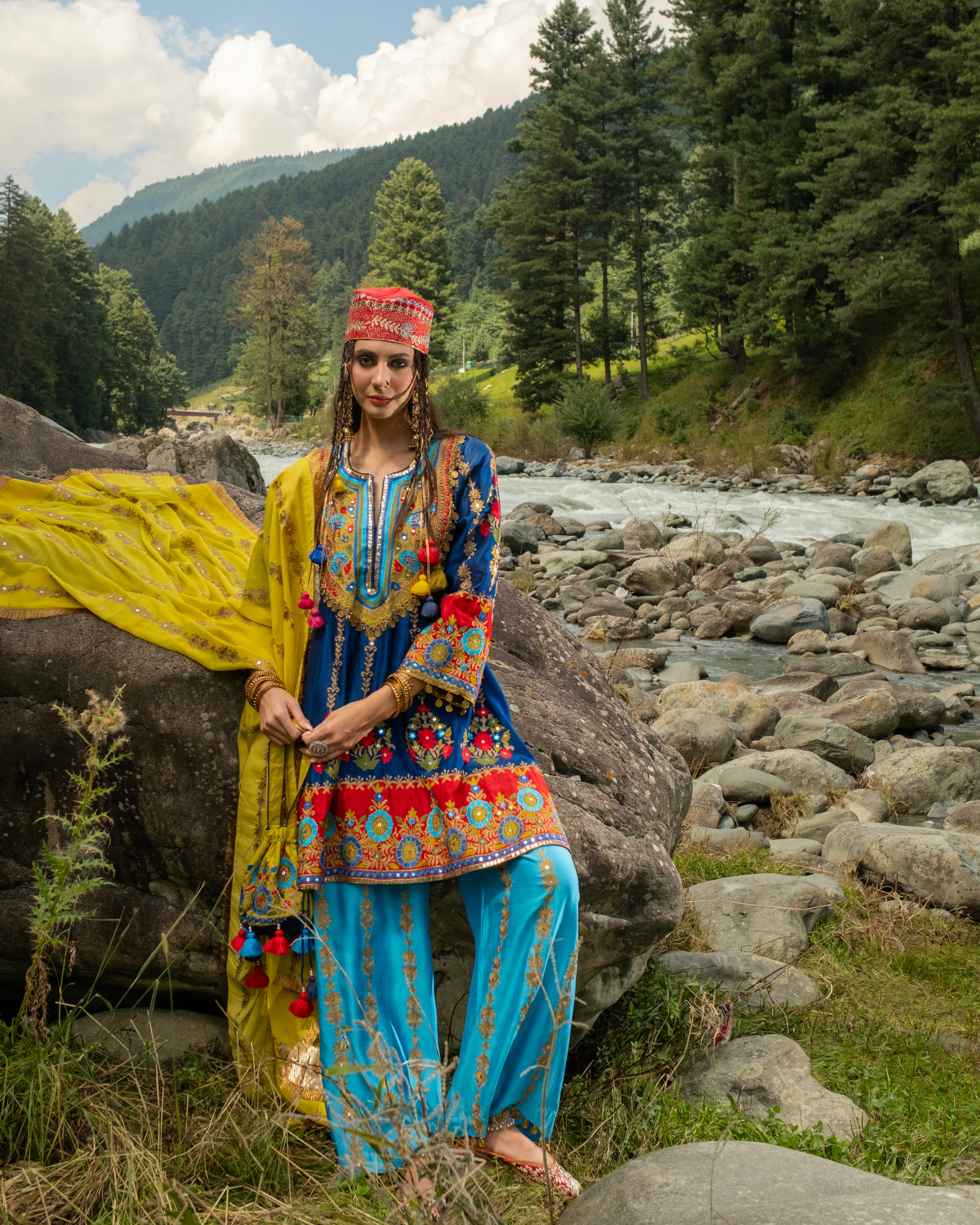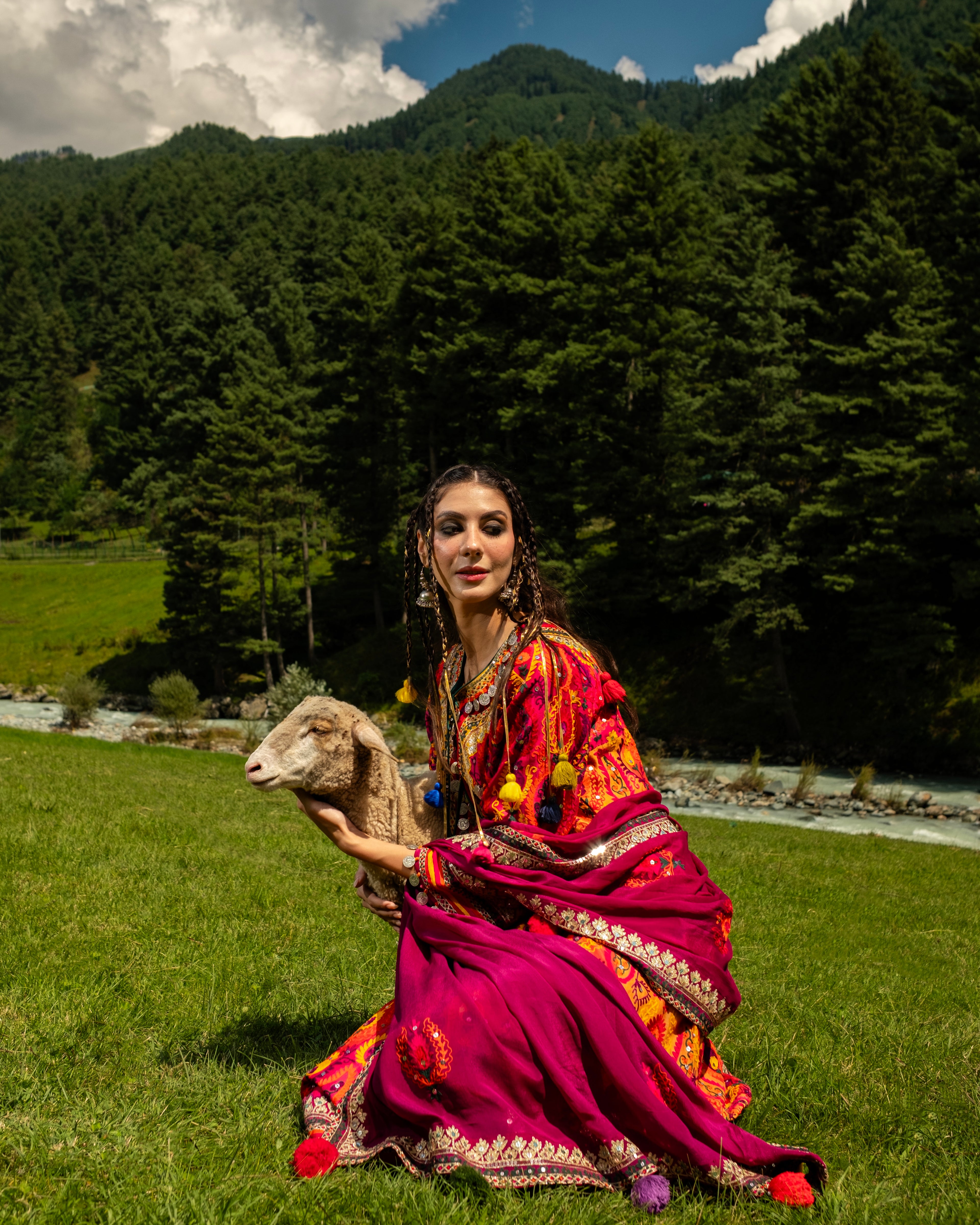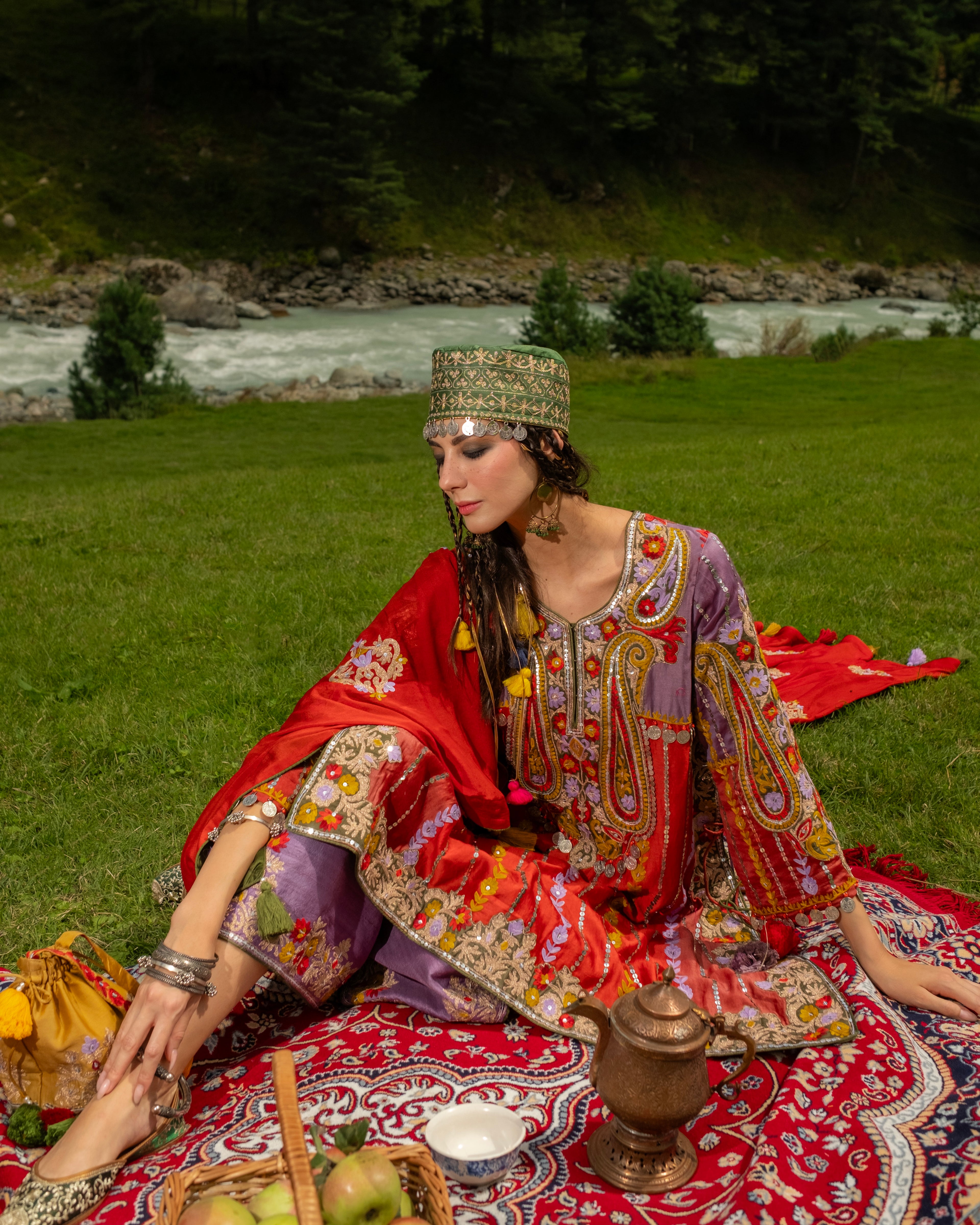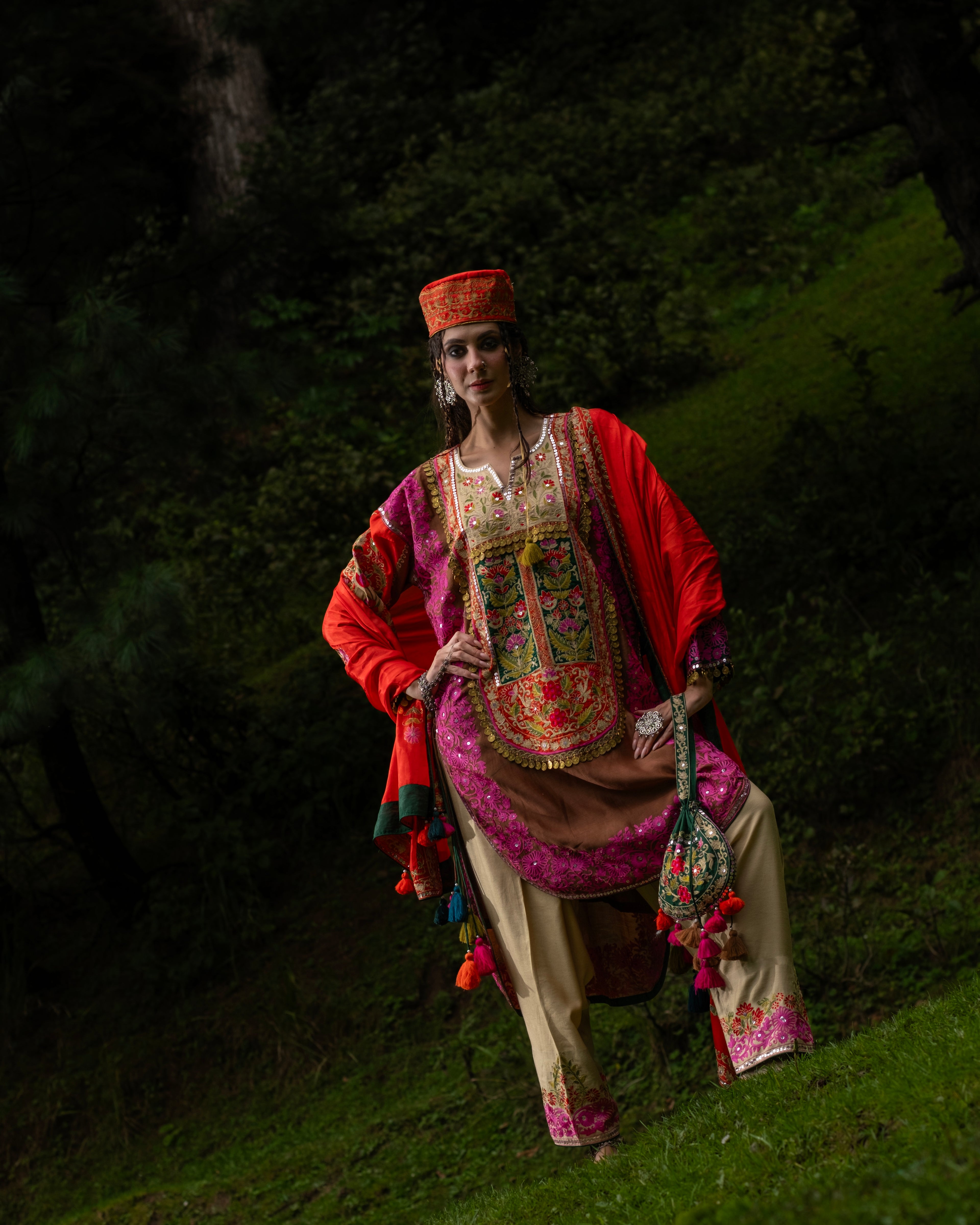 Gurjara, a Sanskrit word, reimagined as a collection inspired by the Gujjar community of Jammu & Kashmir, the people of resilience and honor, rooted in pastoral life and nomadic traditions. The palette is a festival of colours, tilla-aari embroidery, playful pom-poms that will become the statement and detailed resham threadwork reflecting the energy of life in the valleys. This collection celebrates the warmth of people of the state.