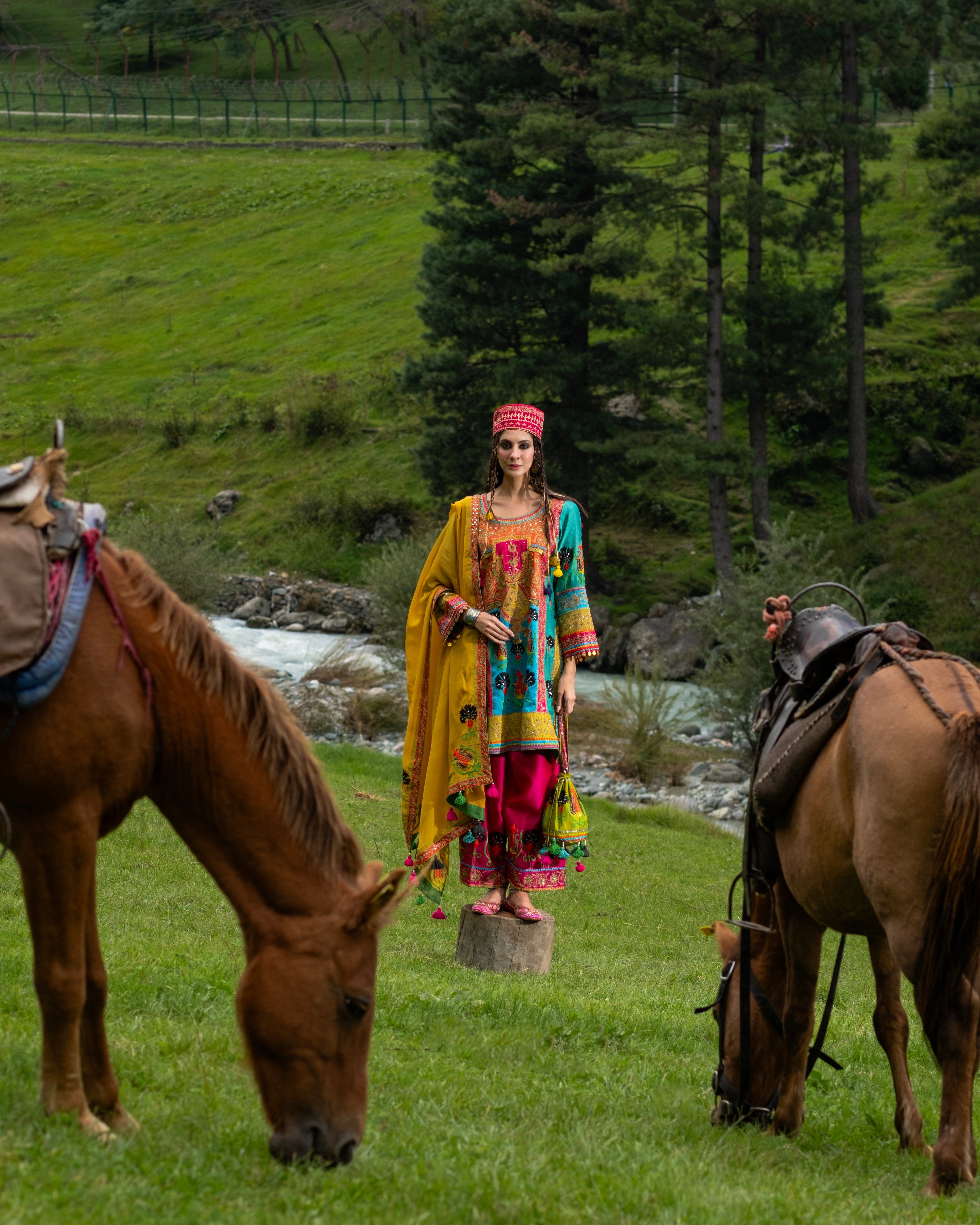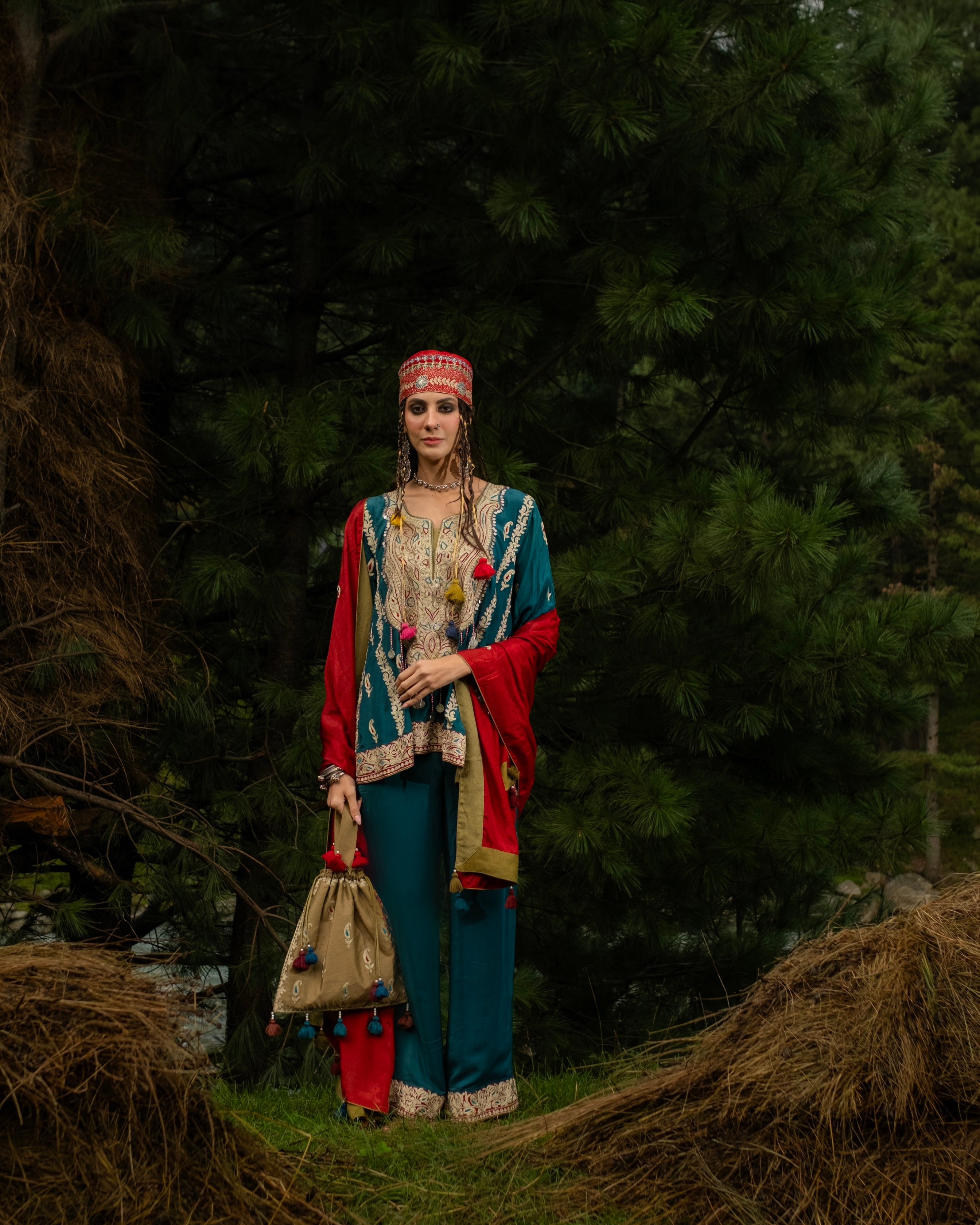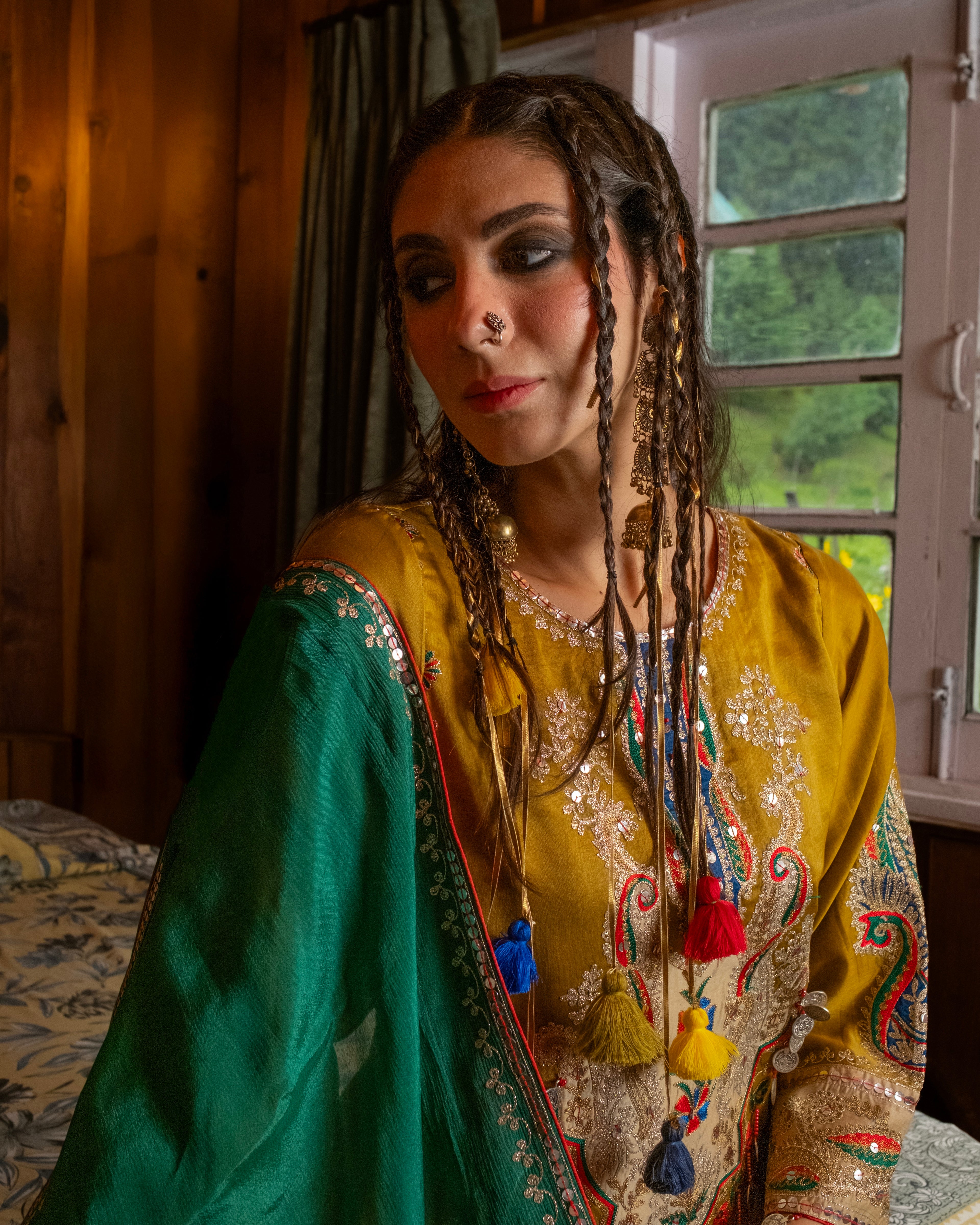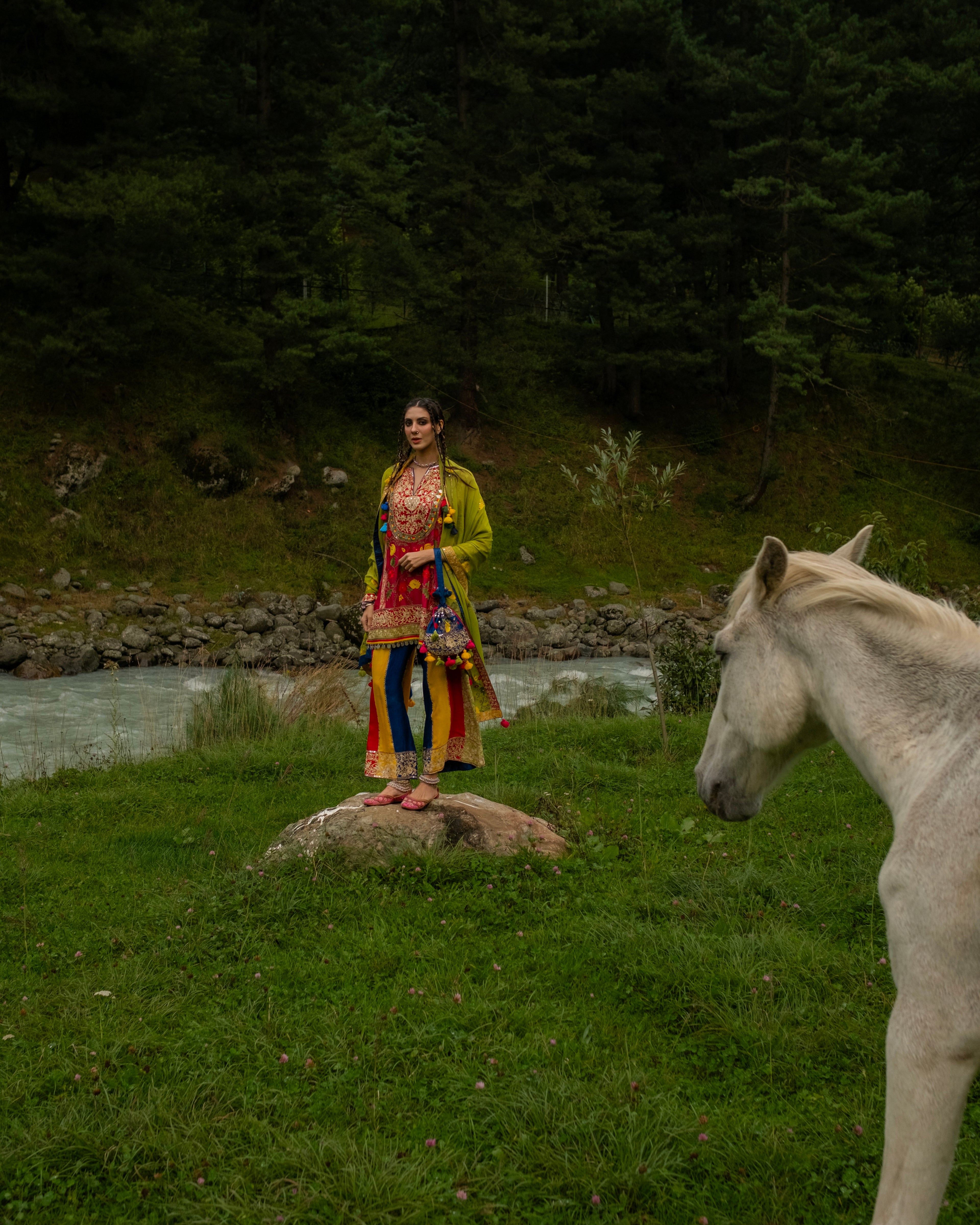 Gurjara, a Sanskrit word, reimagined as a collection inspired by the Gujjar community of Jammu & Kashmir, the people of resilience and honor, rooted in pastoral life and nomadic traditions. The palette is a festival of colours, tilla-aari embroidery, playful pom-poms that will become the statement and detailed resham threadwork reflecting the energy of life in the valleys. This collection celebrates the warmth of people of the state.