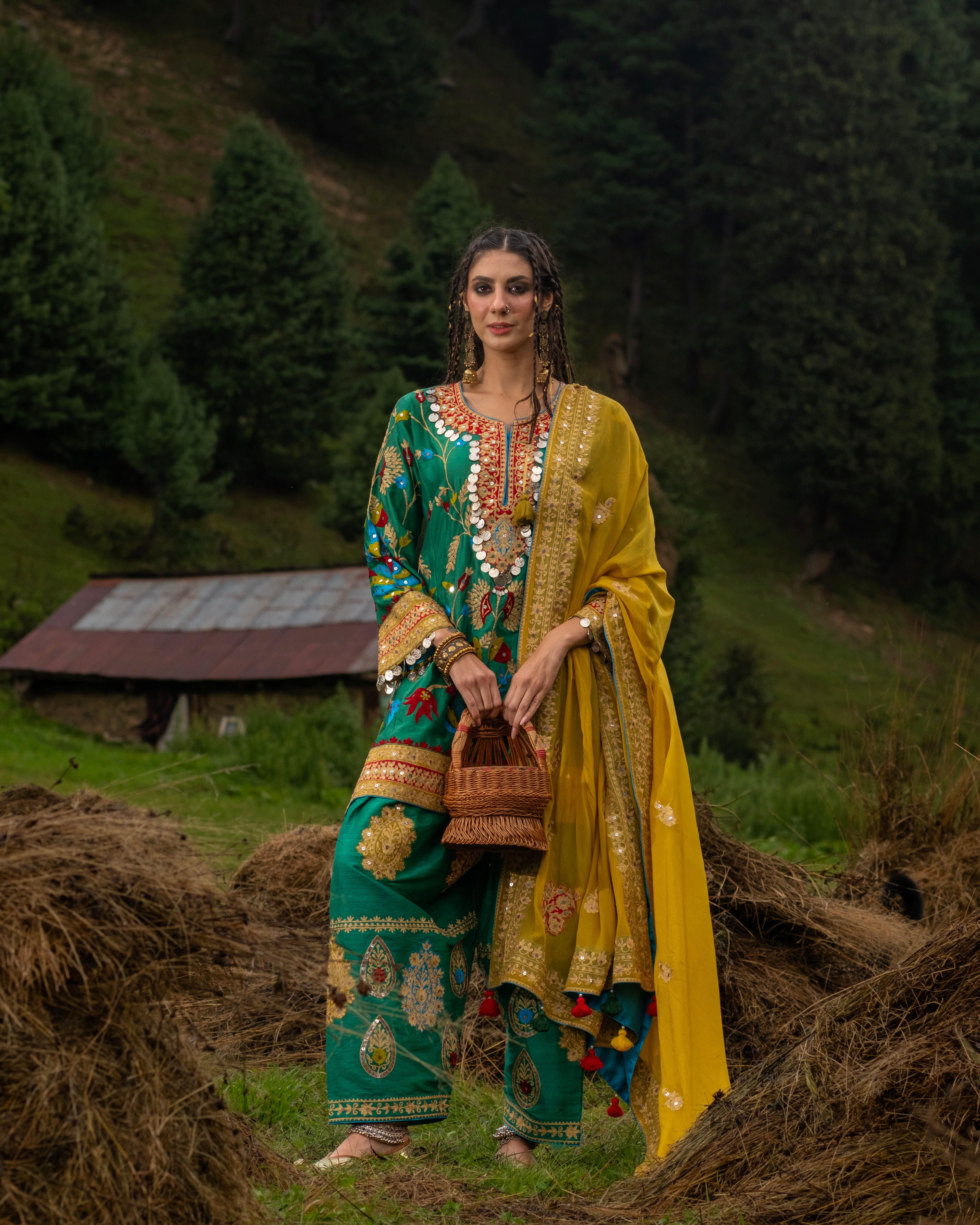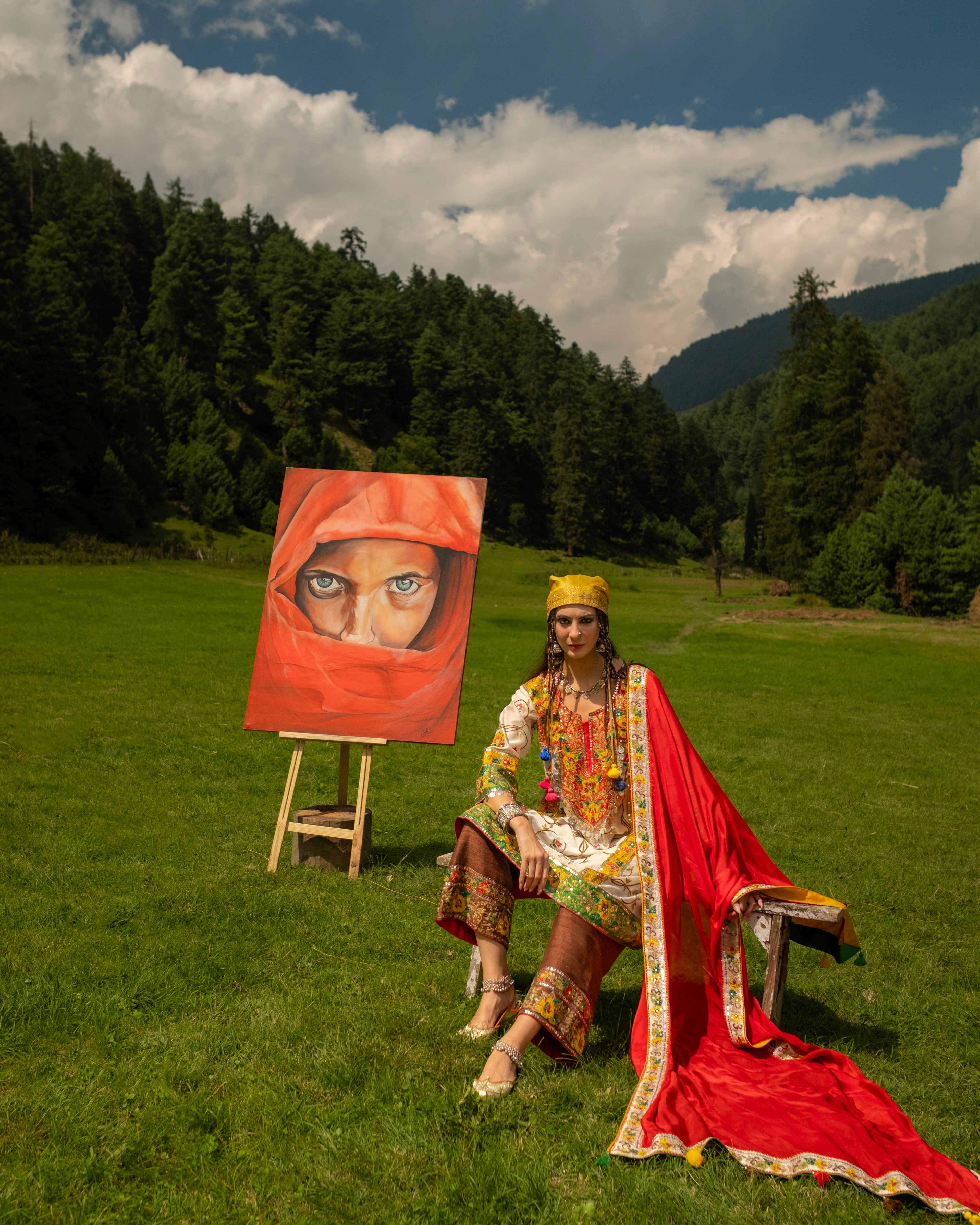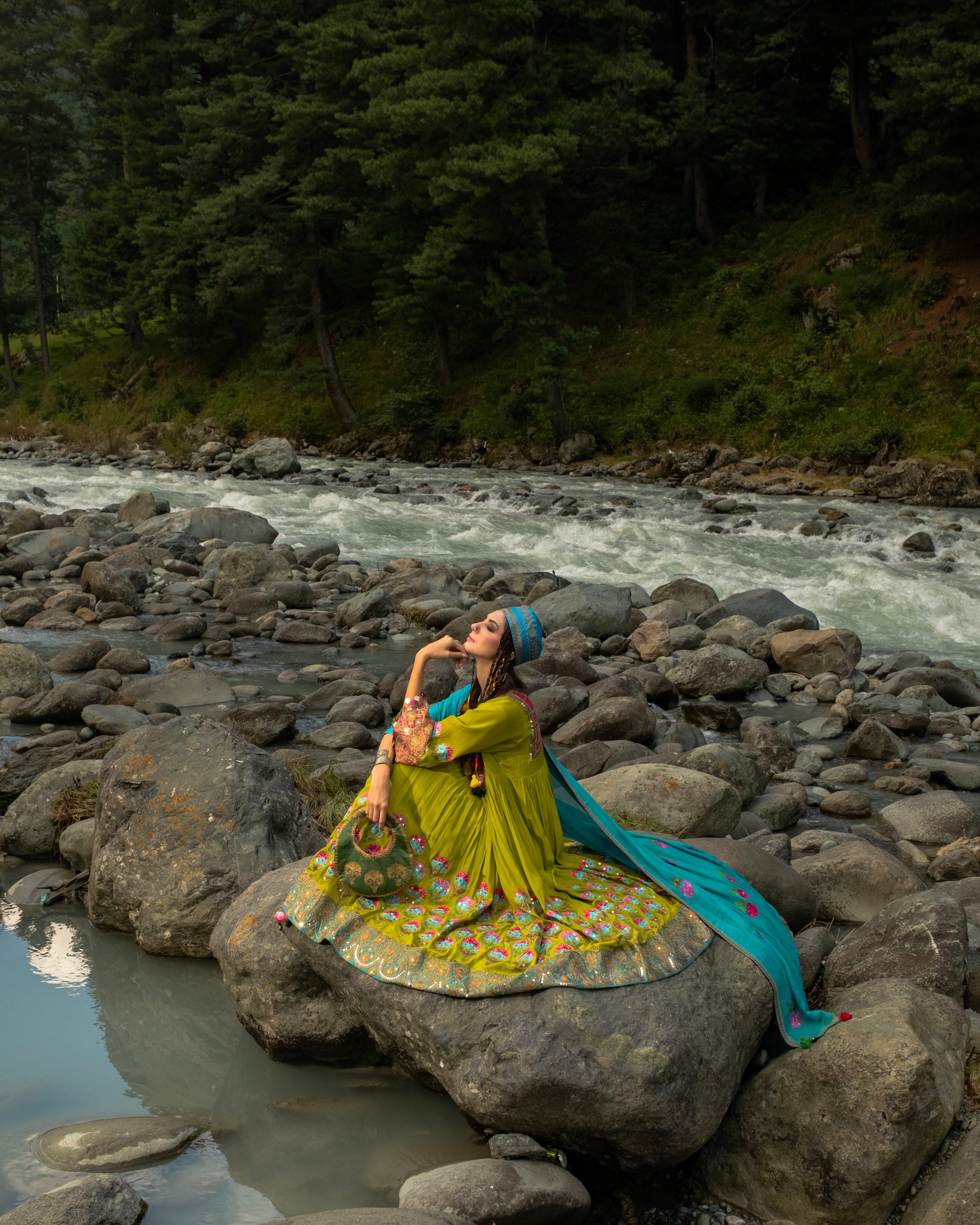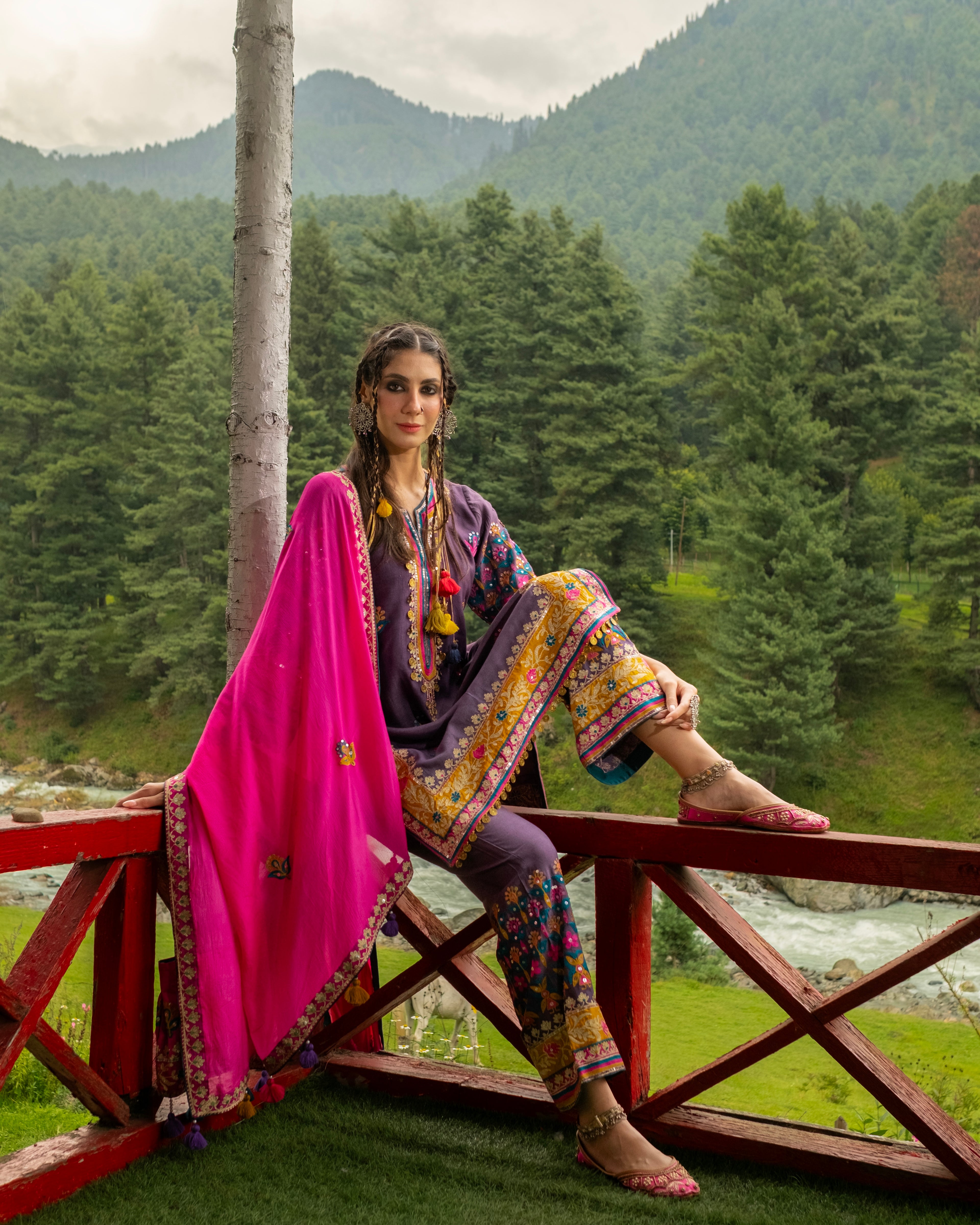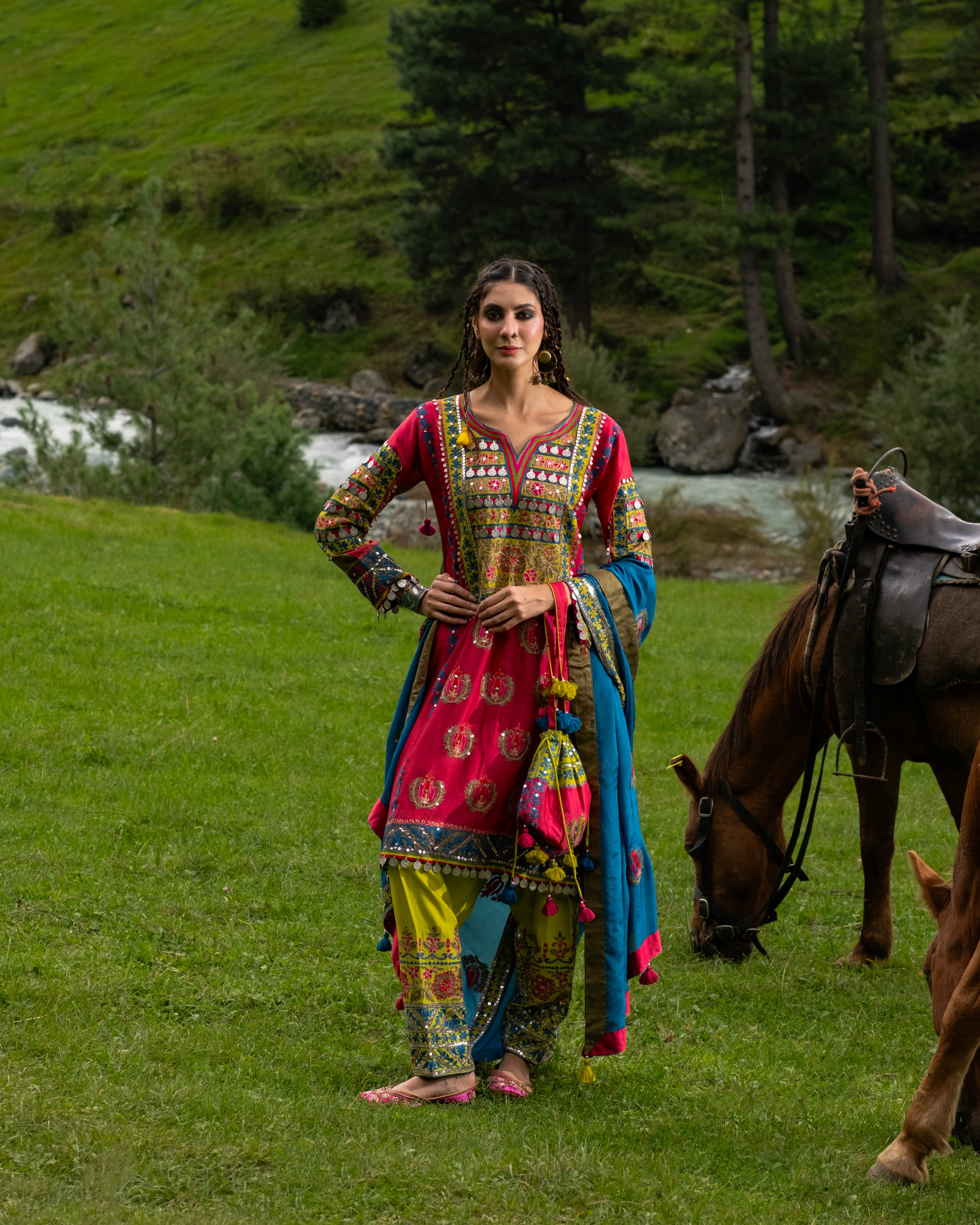 Gurjara, a Sanskrit word, reimagined as a collection inspired by the Gujjar community of Jammu & Kashmir, the people of resilience and honor, rooted in pastoral life and nomadic traditions. The palette is a festival of colours, tilla-aari embroidery, playful pom-poms that will become the statement and detailed resham threadwork reflecting the energy of life in the valleys. This collection celebrates the warmth of people of the state.